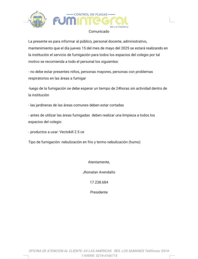 Fumigación y desinfección de las Instalaciones del Colegio La Presentación.